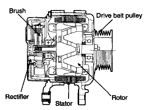 The generator is regulated by the battery voltage detection system. The main components of the generator are the rotor, stator, rectifier, capacitor brushes, bearings and V-ribbed belt pulley. The brush holder contains a built-in electronic voltage regulator.