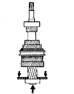 2. Remove the stopper snap ring, snap ring, 5th and 4th speed gear, needle roller bearing, 4th speed gear sleeve, synchronizer ring (3rd & 4th), synchronizer spring (1st, 2nd, 3rd, 4th), synchronizer sleeve (3rd & 4th), 3rd speed gear and needle roller bearing.
