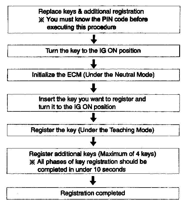 2. When the key #1 is registered and key #2 is not registered, Put the key #1 in the IG/ON or the start position and remove it. The engine can be started with the unregistered key #2.