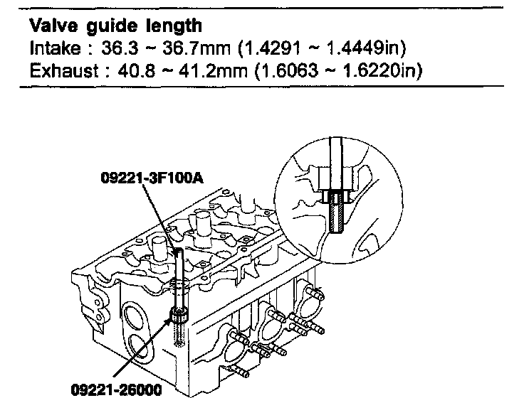 3. Using the SST (09221-3F100A, 09221-26000), press-fit the valve guide. The valve guide must be press-fitted from the upper side of the cylinder head. Keep in mind that the intake and exhaust valve guides are different in length.