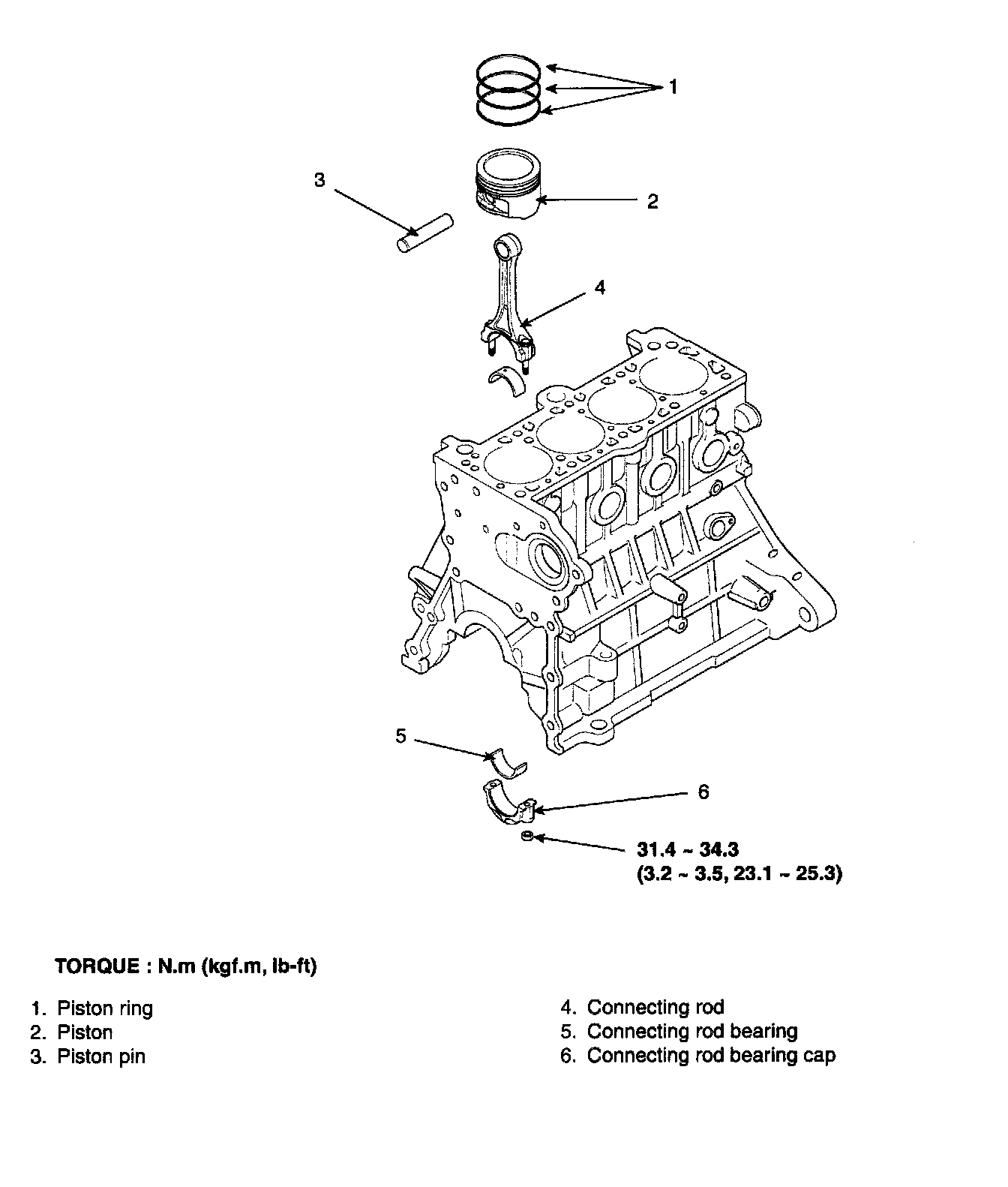2) Push the piston, connecting rod assembly and upper bearing through the top of the cylinder block.