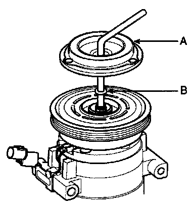- Be careful not to damage the pulley (B) and compressor during removal/installation.