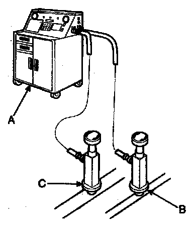 Recovery/Recycling/Charging System (A) to the high-pressure service port (B) and the law-pressure service port (C) as shown, following the equipment manufacturer's instructions.