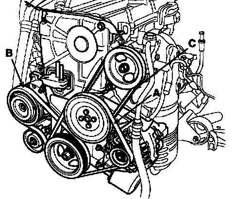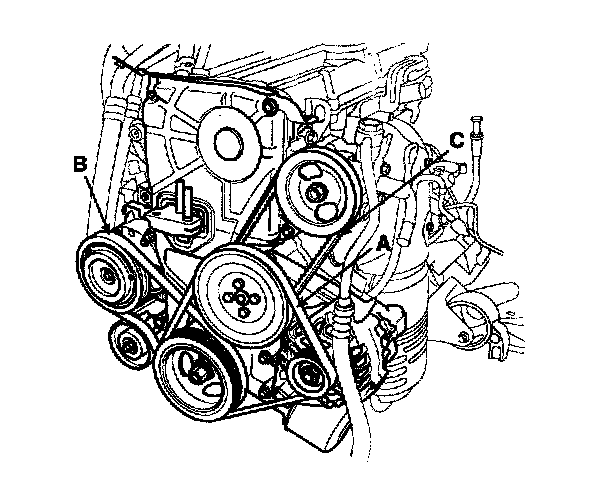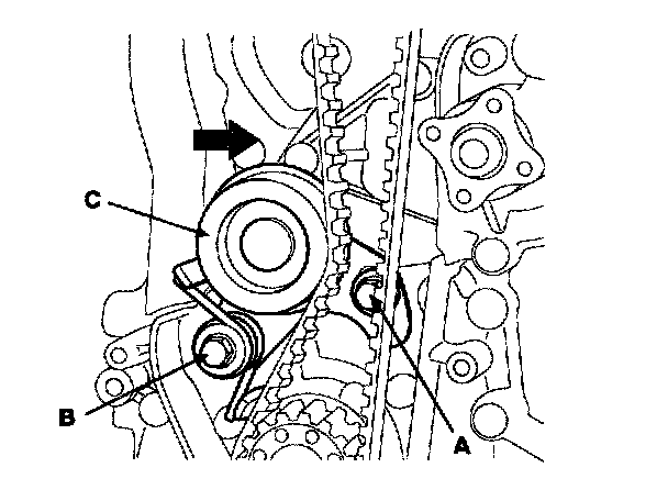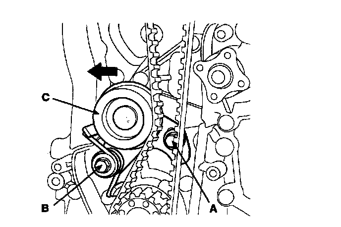 13. Move the tensioner pulley (C) in the direction of the arrow shown after loosen the mounting bolt (A, B). And temporarily tighten mounting bolt (A, B).