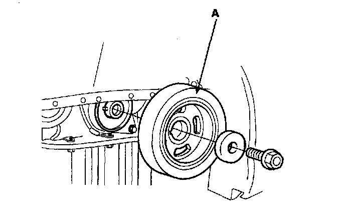 10. Turn the crankshaft pulley, and align its groove with timing mark "T" of the timing belt cover. Check that the timing mark of camshaft sprocket (A) is aligned with the timing mark of cylinder head cover. (No.1 cylinder compression TDC position)