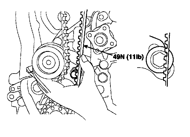 Verify that when the tensioner and the tension side of the timing belt are pushed in horizontally with a moderate force [approximately 49 N (11 lbs.)], the timing belt cog end is approximately 1/2 of the tensioner mounting bolt head radius (across flats) away from the bolt head center.