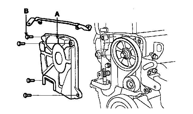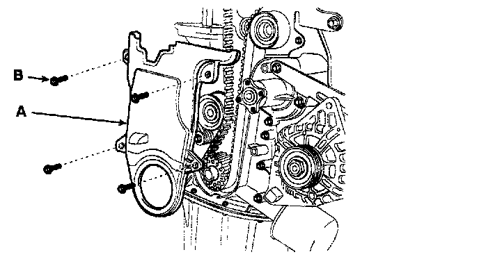 9. Remove the 4 bolts (B) and timing belt upper cover (A).