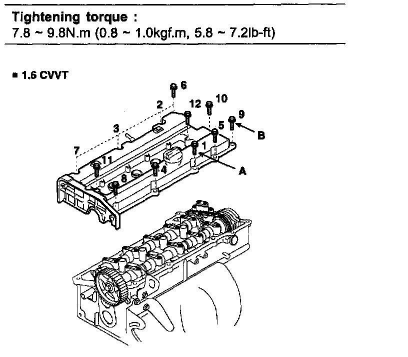 1) Install the cylinder head cover (A) and bolts (B).