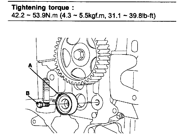 5. Install the idler pulley (A) and tighten the bolt (B) to the specified torque.