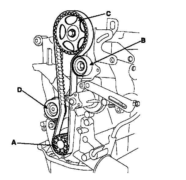 Crankshaft sprocket (A) -> idler pulley (B) -> camshaft sprocket (C) -> timing belt tensioner (D).