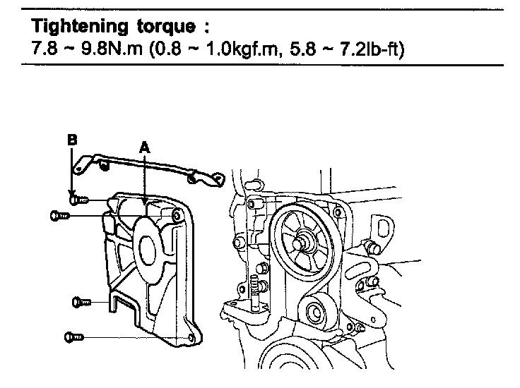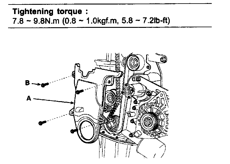10. Install the timing belt lower cover (A) with 5 bolts (B).