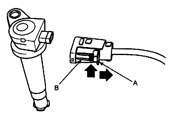 NOTE: When removing the ignition coil connector, pull the lock pin (A) and push the clip (B).