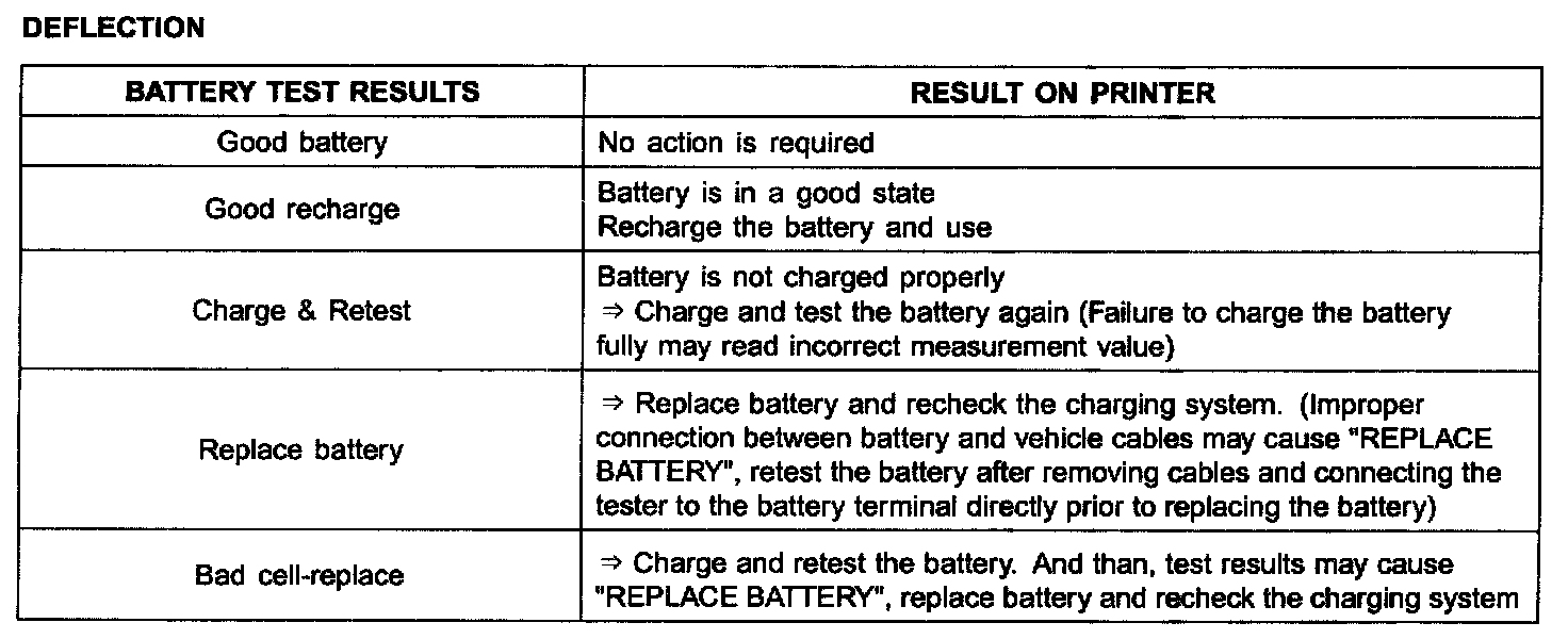 A relevant action must be given according to the test results by referring to the battery test results as shown in the table.