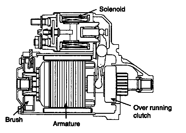 The contacts close and the starter motor cranks. In order to prevent damage caused by excessive rotation of the starter armature when the engine starts, the clutch pinion gear overruns.