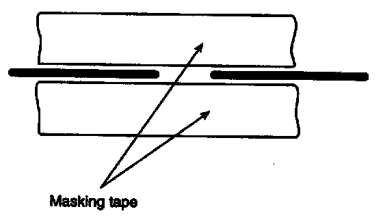 Wipe the glass adjacent to the broken heater line, clean with silicone remove and attach the masking tape as shown. Shake the conductive paint container well, and apply three coats with a brush at intervals of about 15 minutes apart. Remove the tape and allow sufficient time for drying before applying power. For a better finish, scrape away excess deposits with a knife after the paint has completely dried. (Allow 24 hours).