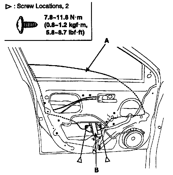 2. Carefully move the glass (A) until you can see the bolts, then loosen them. Separate the glass from the glass run and carefully pull the glass out through the window slot (B).