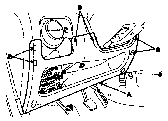2. Remove the crash pad lower panel (A). Take care of fixing clips (B).