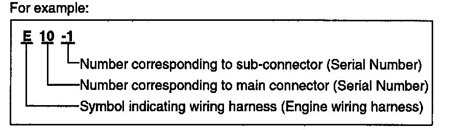 A connector identification symbol consists of a wiring harness location classification symbol corresponding to a wiring harness location and number corresponding to the connector.