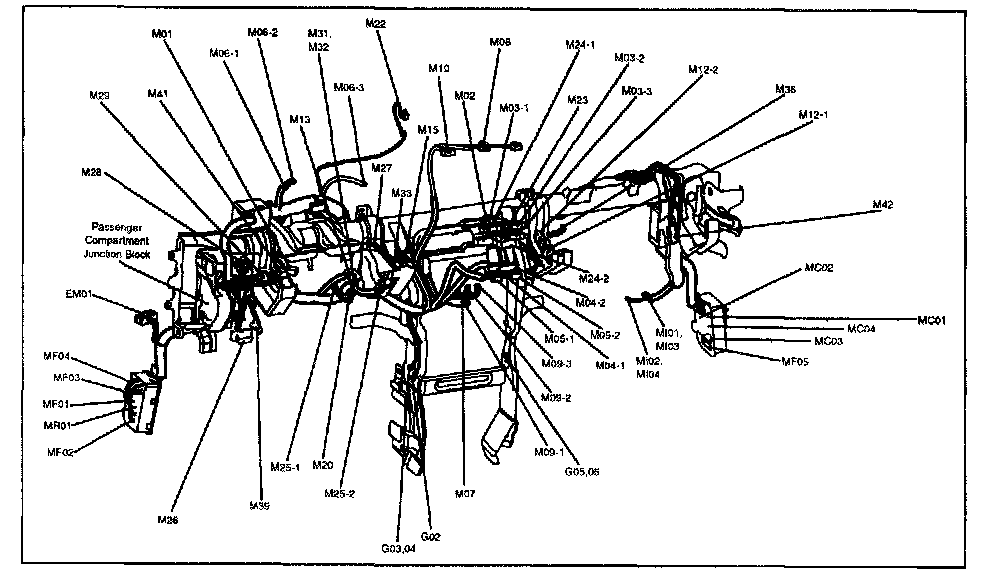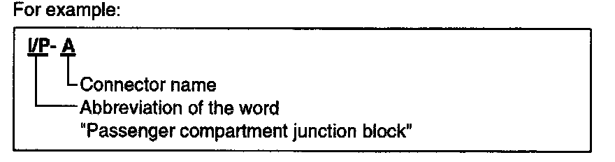 A junction block identification symbol consists of a wiring harness location classification symbol corresponding to a wiring harness location and number corresponding to the connector in the junction block.