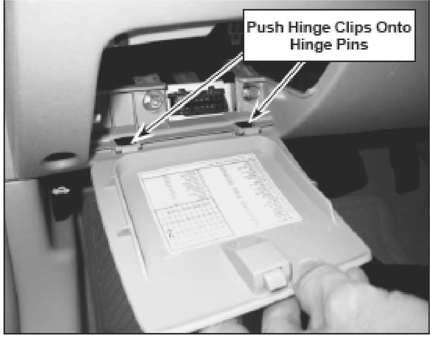 2. Insert new fuse box cover hinge clips onto instrument panel hinge pins and push inward until the cover snaps into place. Close fuse box cover.