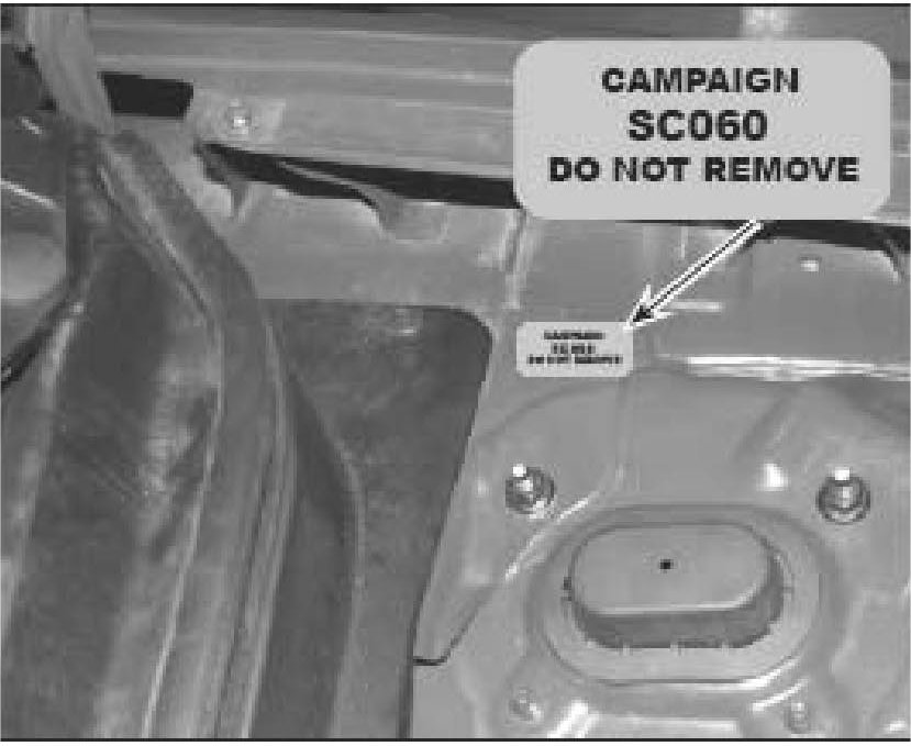 4. Install SCO60 Campaign Completion Label in the engine compartment at the rear of the driver's side strut tower, as shown.