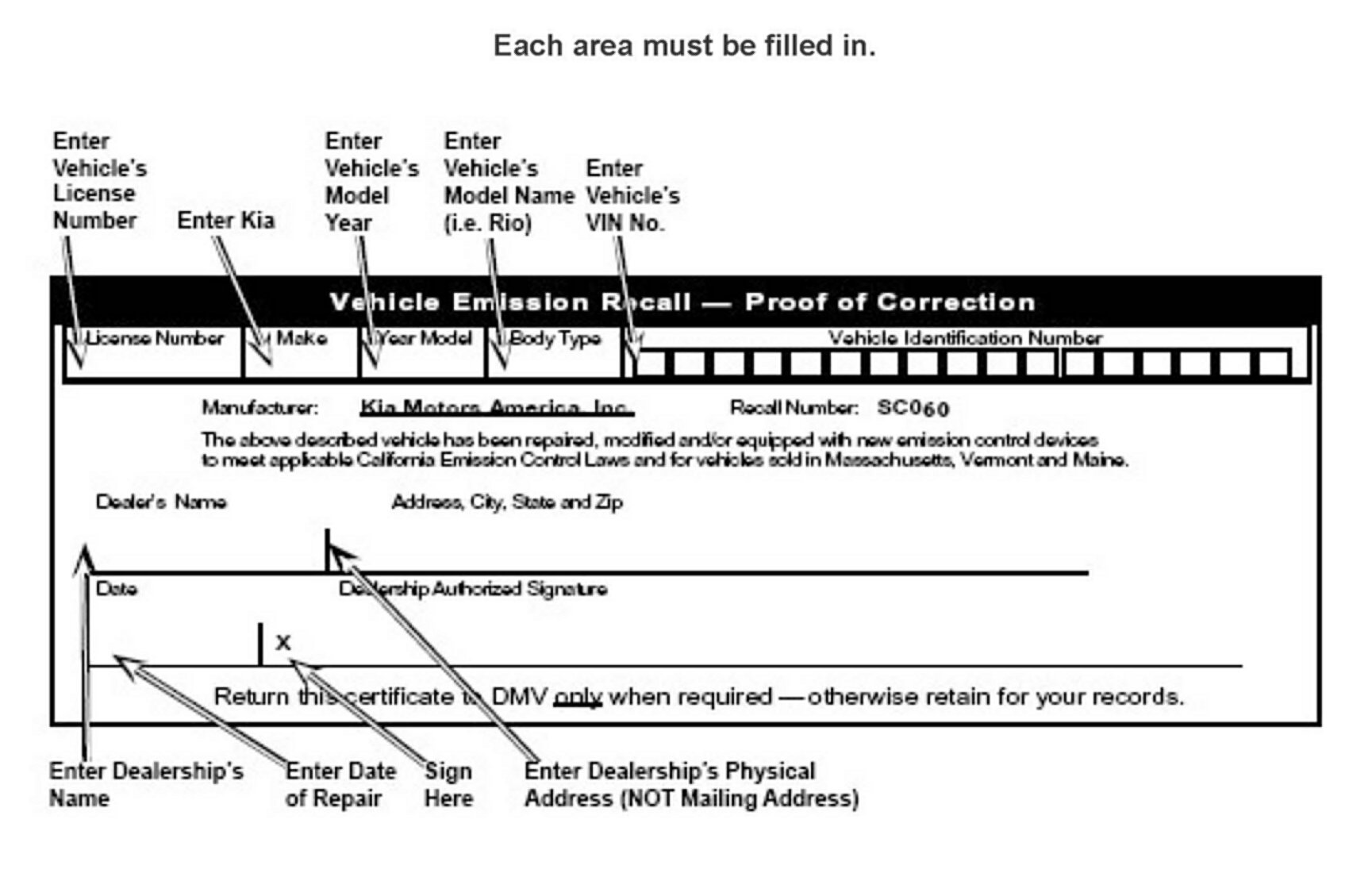 A Vehicle Emission Recall - Proof of Correction card must be filled out for all vehicles registered in California, Massachusetts, Vermont, and Maine. California, Massachusetts, Vermont, and Maine residents who own an affected vehicle will be required to possess a Vehicle Emission Recall - Proof of Correction card as evidence of voluntary service campaign completion when they apply for vehicle registration renewal.