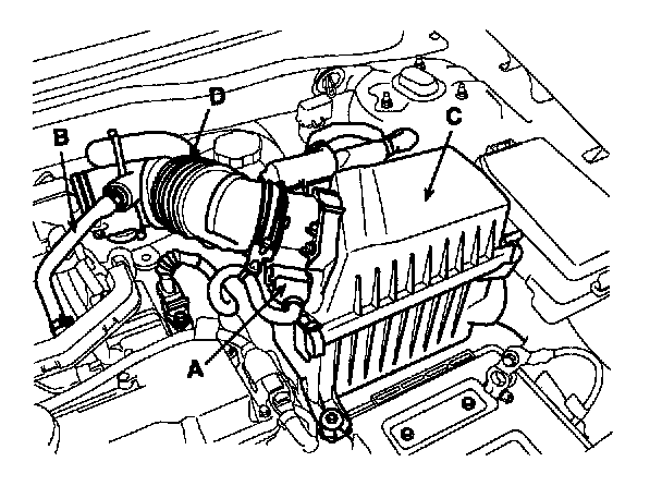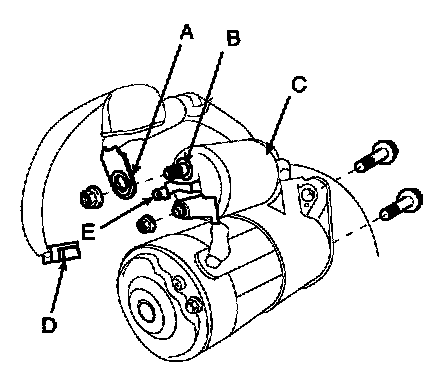 4. Disconnect the starter cable (A) from the B terminal (B) on the solenoid (C), then disconnect the connector (D) from the S terminal (E).
