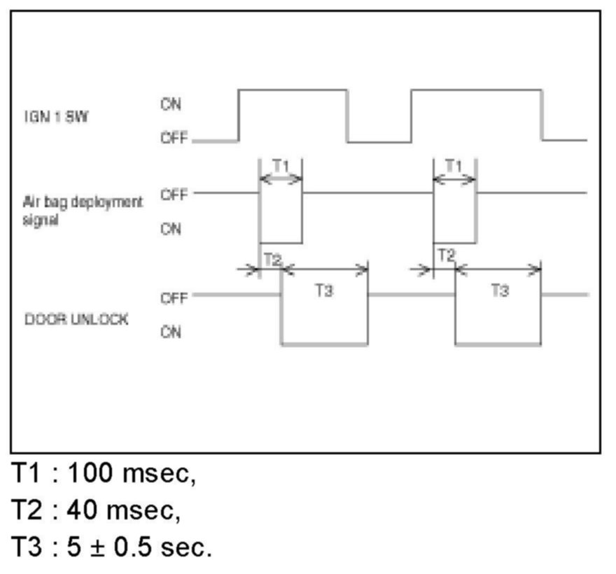 1. With ignition turned ON, if the air bag deploys, a crash signal is received and simultaneously sends an unlock output to all doors.