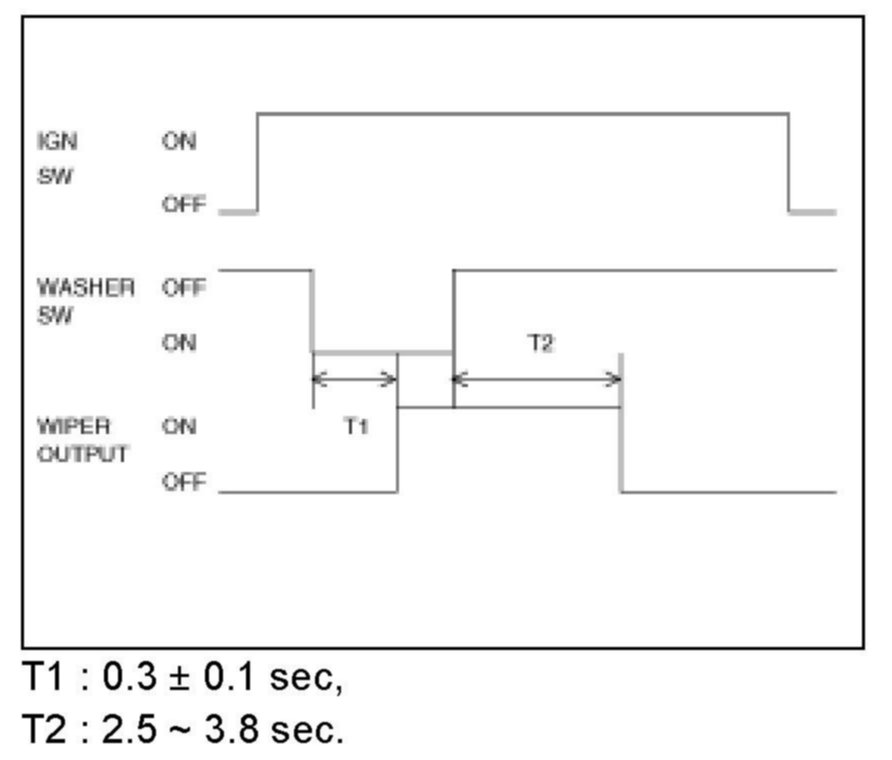 1. If washer switch is turned on, wiper output is ON after 0.3 sec. (T1)