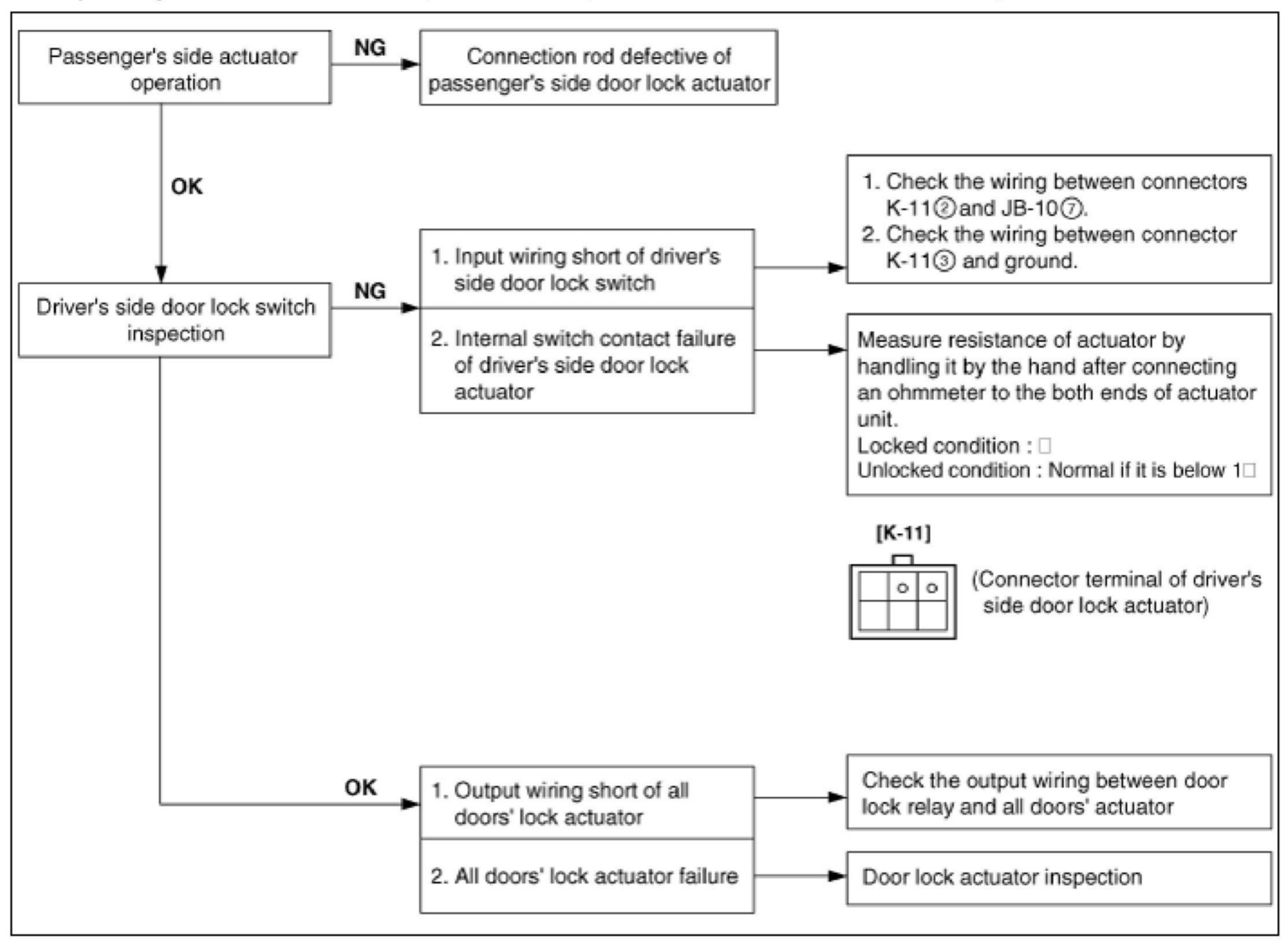 2. Unlock function works but lock function does not work. -> Since door lock relay is fail, replace the door lock relay.