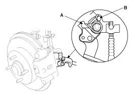 2. Make sure the parking brake arm (A) on the rear brake caliper contacts the brake caliper pin (B).