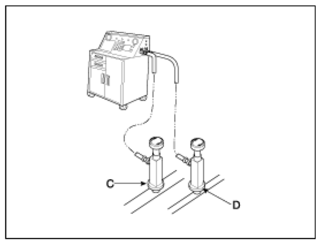 2. Connect a R-134a refrigerant Recovery/Recycling/charging System to the high-pressure service port (D) and the low-pressure service port (C) as shown, following the equipment manufacturer's instructions.