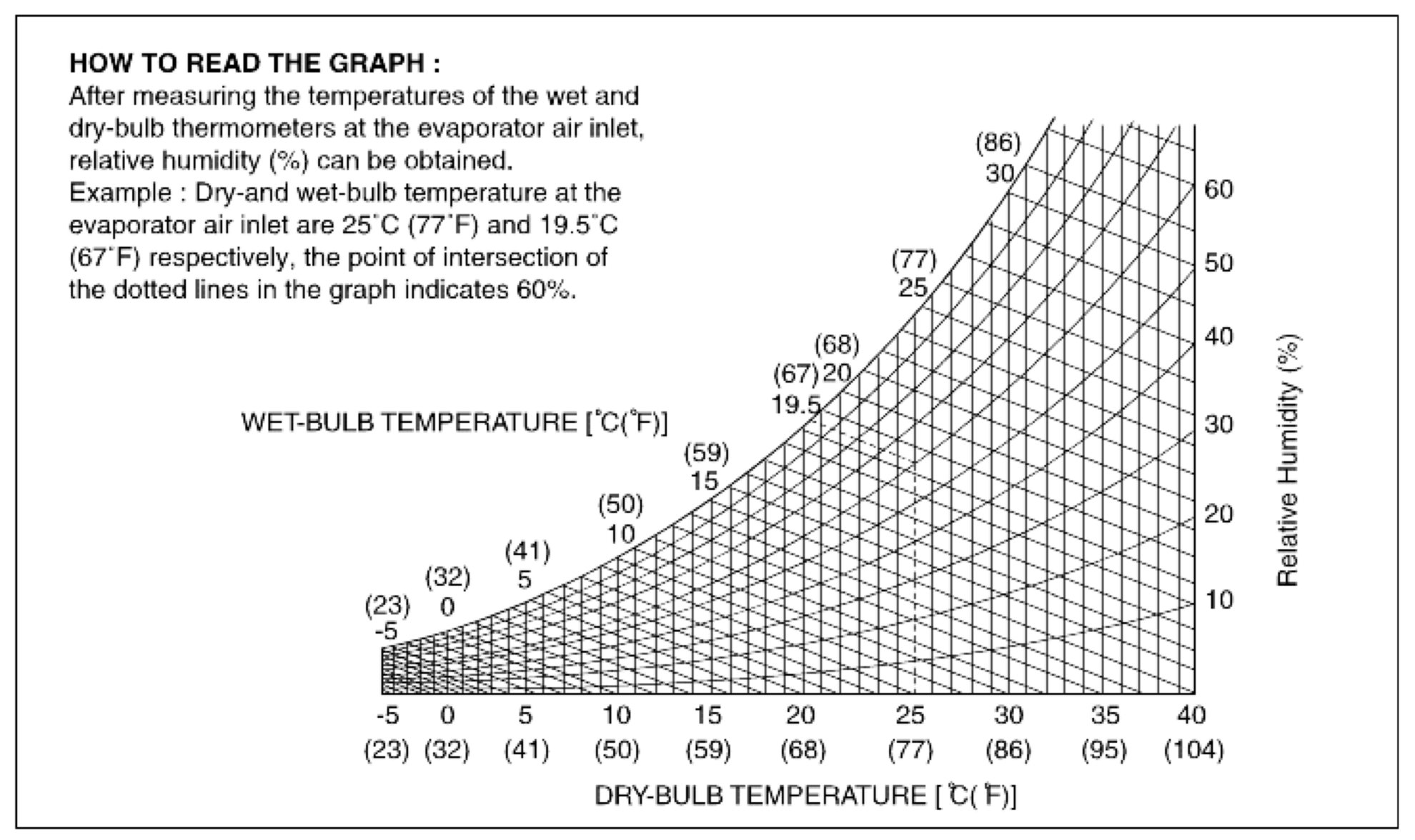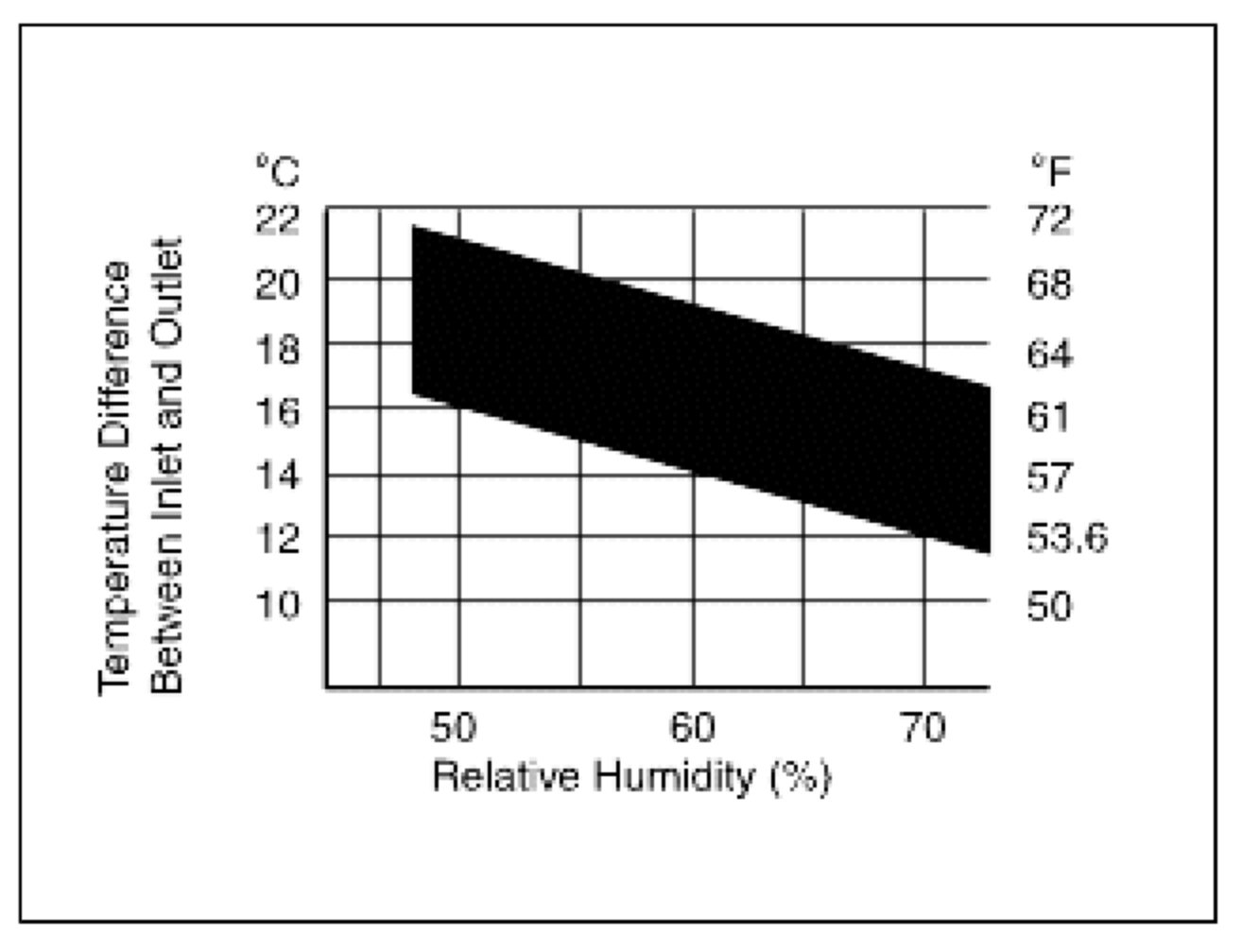 10. Check that the intersection of the relative humidity and temperature difference falls within the block. If the intersection is within the block, cooling performance is satisfactory.