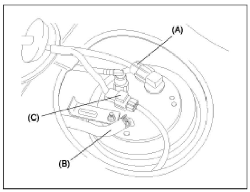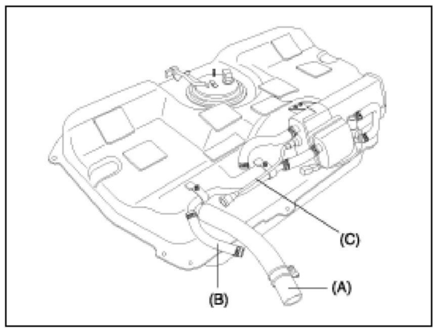 7. Disconnect the fuel filler hose (A), the canister drain hose (B) and the vapor tube (C).