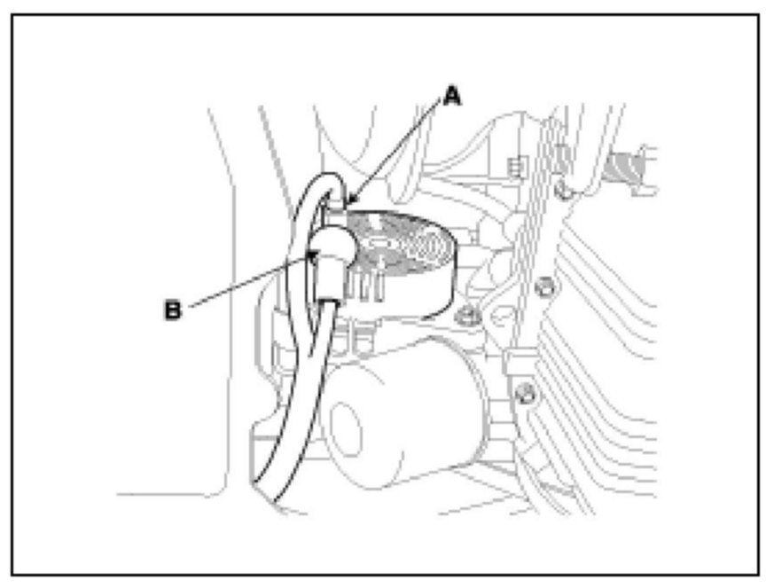2. Disconnect the alternator connector (A), and remove the cable (B) from alternator "B" terminal.
