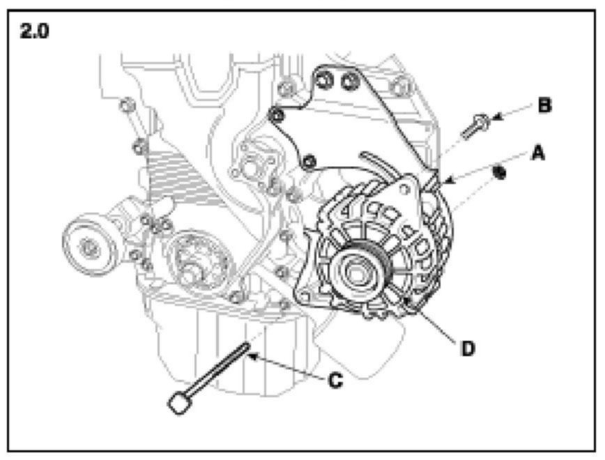 6. Pull out the through bolt (C) and then remove the alternator (D).