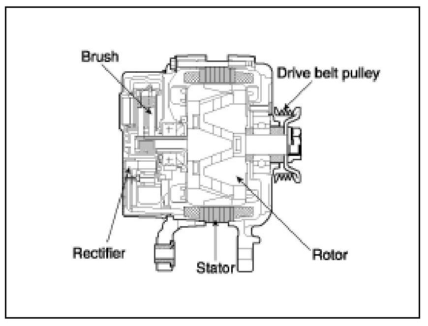 The main components of the alternator are the rotor, stator, rectifier, capacitor, brushes, bearings and V-ribbed belt pulley. The brush holder contains a built-in electronic voltage regulator.