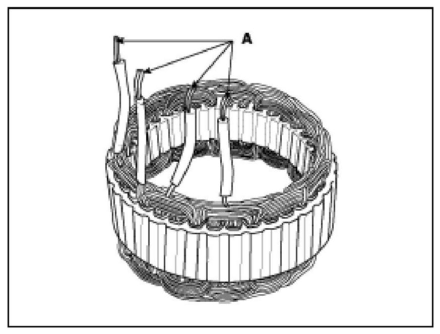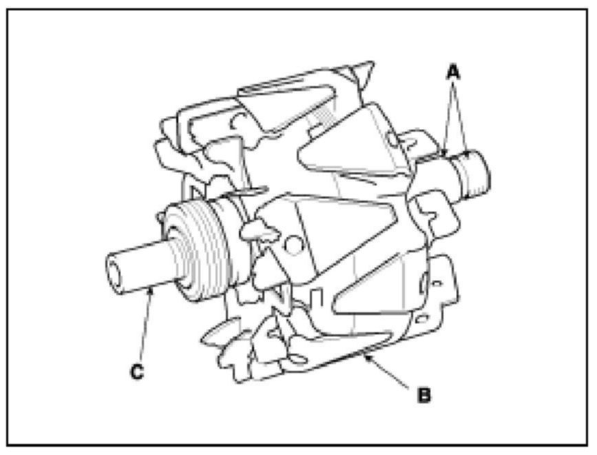 2. Check that there is no continuity between the slip rings and the rotor (B) or rotor shaft (C).