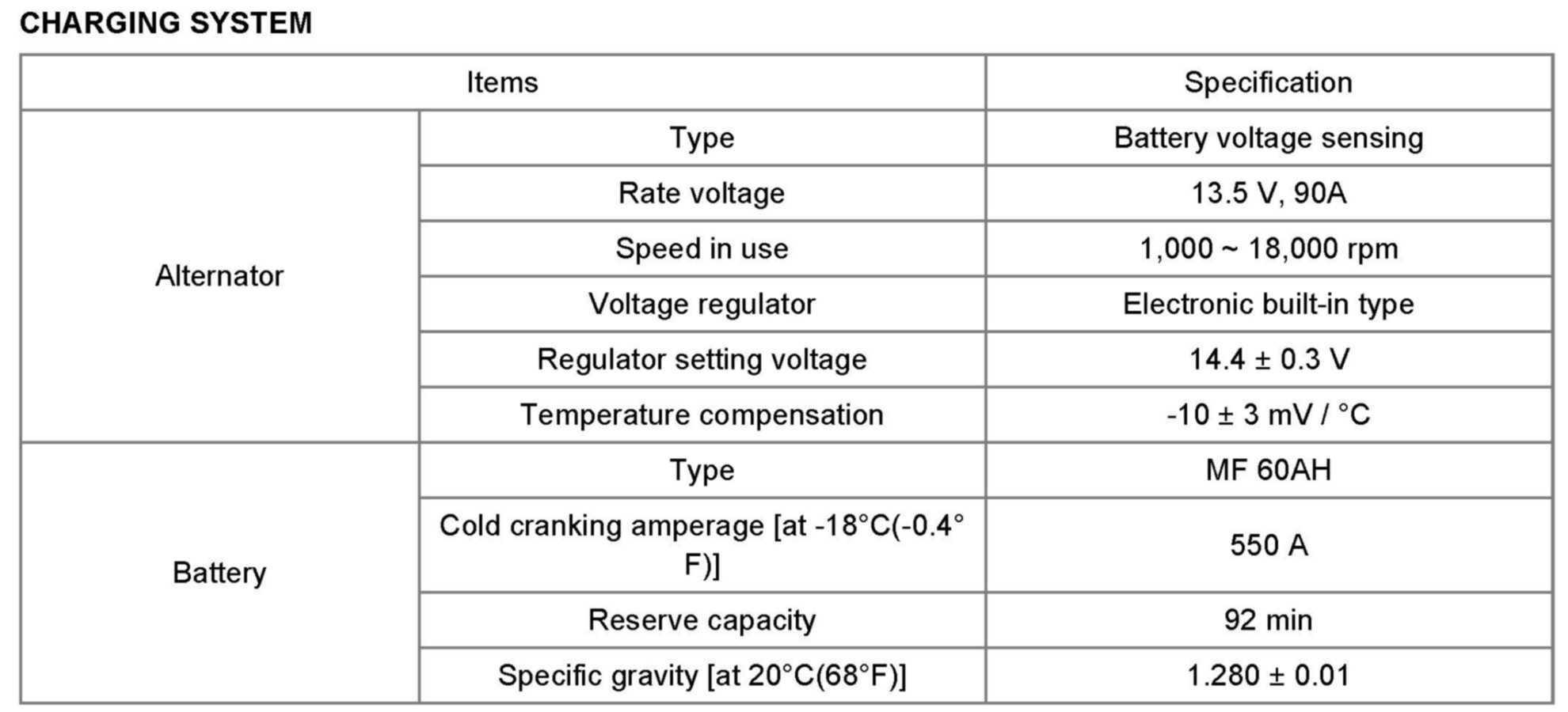 Charging System: Specifications