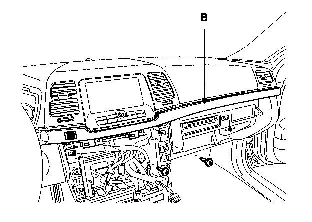 4. After loosening the screw then remove the crash pad center garnish (B).