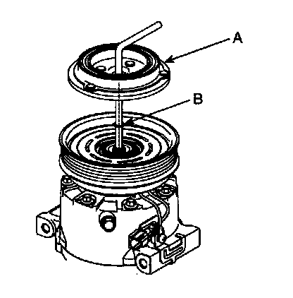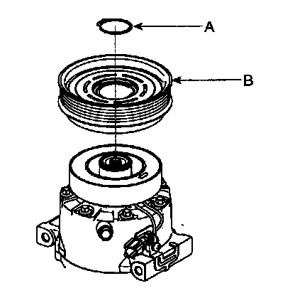 - Be careful not to damage the pulley (B) and compressor during removal/installation.