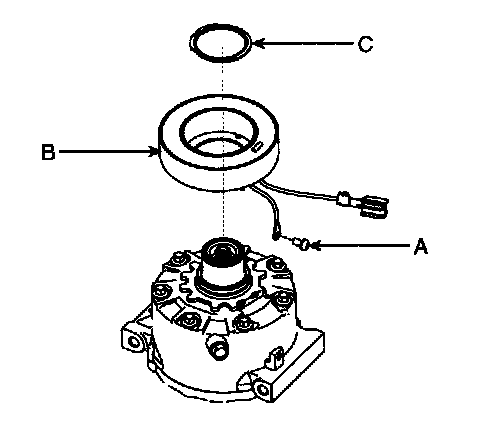 4. Remove the screw (A) from the field coil ground terminal. Remove the retainer ring (B) and then remove the field coil (C) from the shaft with a puller. Be careful not to damage the coil and compressor.