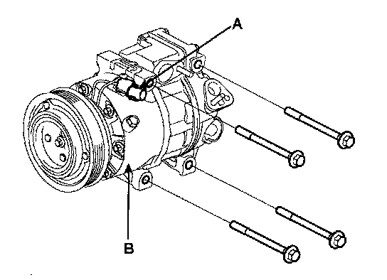 6. Disconnect the compressor clutch connector (A), and then remove 4 mounting bolts and the compressor.