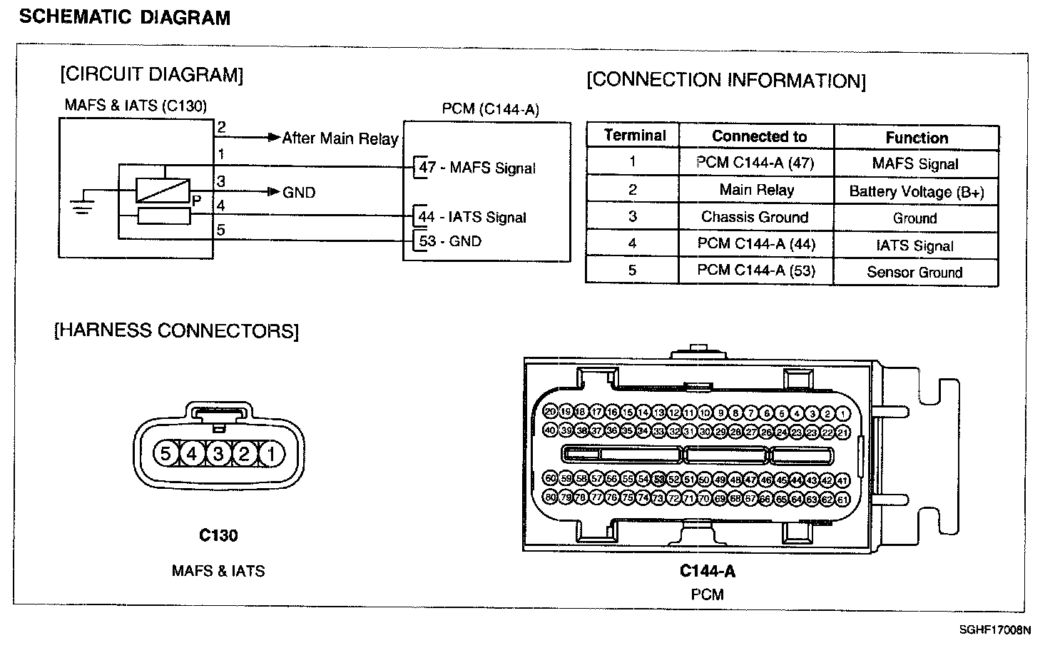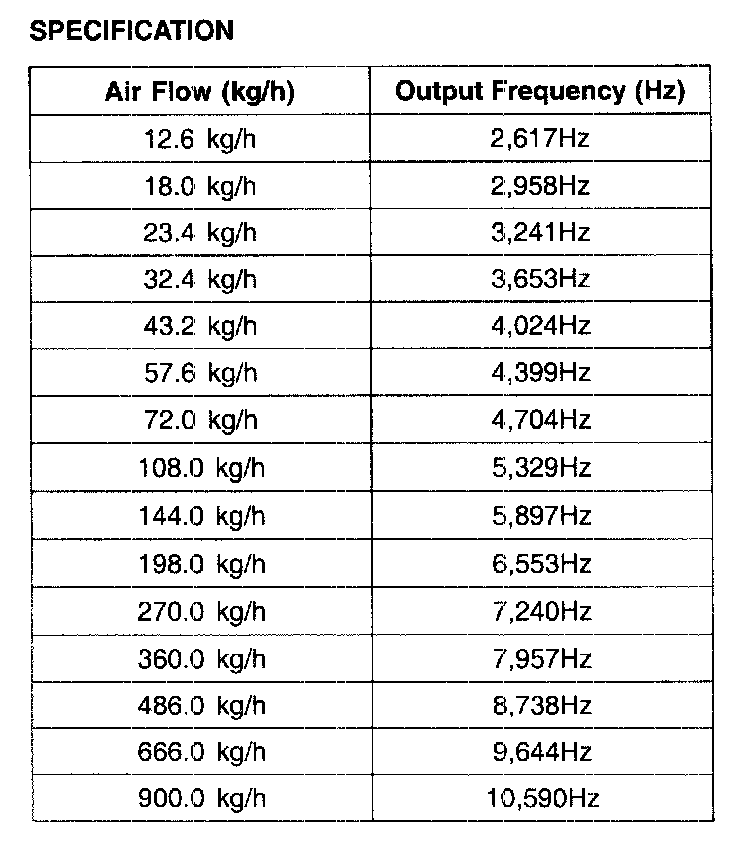 Mass Air Flow Sensor (MAFS) is a hot-film type sensor and is located in between the air cleaner and the throttle body. It consists of a tube, a sensor assembly and honey cell and detects intake air quantity flowing into the intake manifold. While the intake air coming out of the air cleaner flows by the honey cell, it becomes laminar flow, and then it passes the hot-film. At this time, heat transfer is generated by convection and this sensor loses its energy. This sensor detects the mass air flow by using the energy loss and transfers the information to the PCM by frequency. The PCM calculates fuel quantity and ignition timing.