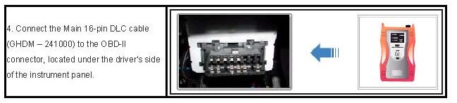 4. Connect the Main 16-pin DLC cable (GHDM - 241000) to the OBD-II connector, located under the drivers side of the instrument panel.