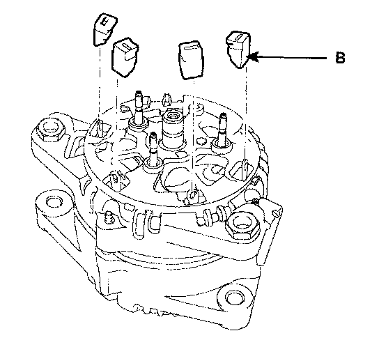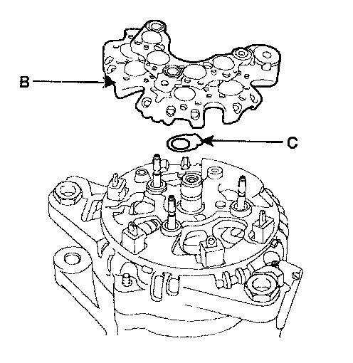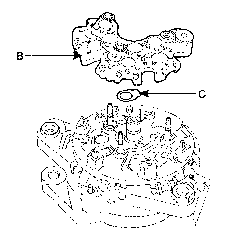 4. Remove the four screws, the rectifier(B) and the rubber seal(C).