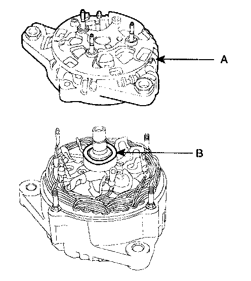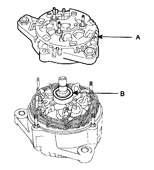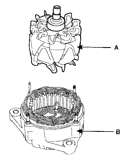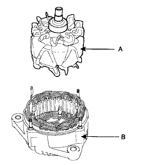 7. Remove the rotor(A) from the stator and front frame assembly(B).