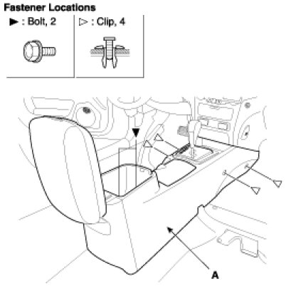 2. After loosening the console mounting bolt, remove the floor console assembly (A).