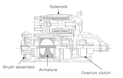 The contacts close and the starter motor cranks. In order to prevent damage caused by excessive rotation of the starter armature when the engine starts, the clutch pinion gear overruns.