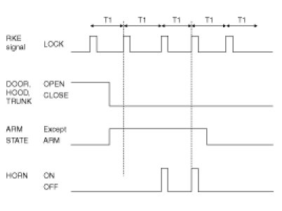 (1) Under DOOR, TRUNK or HOOD: closed, horn and hazard(1s-output) signals are output if RKE LOCK signal is received again within T1 from the moment when the system transits to ARM mode by RKE LOCK operation and ARM mode is kept.